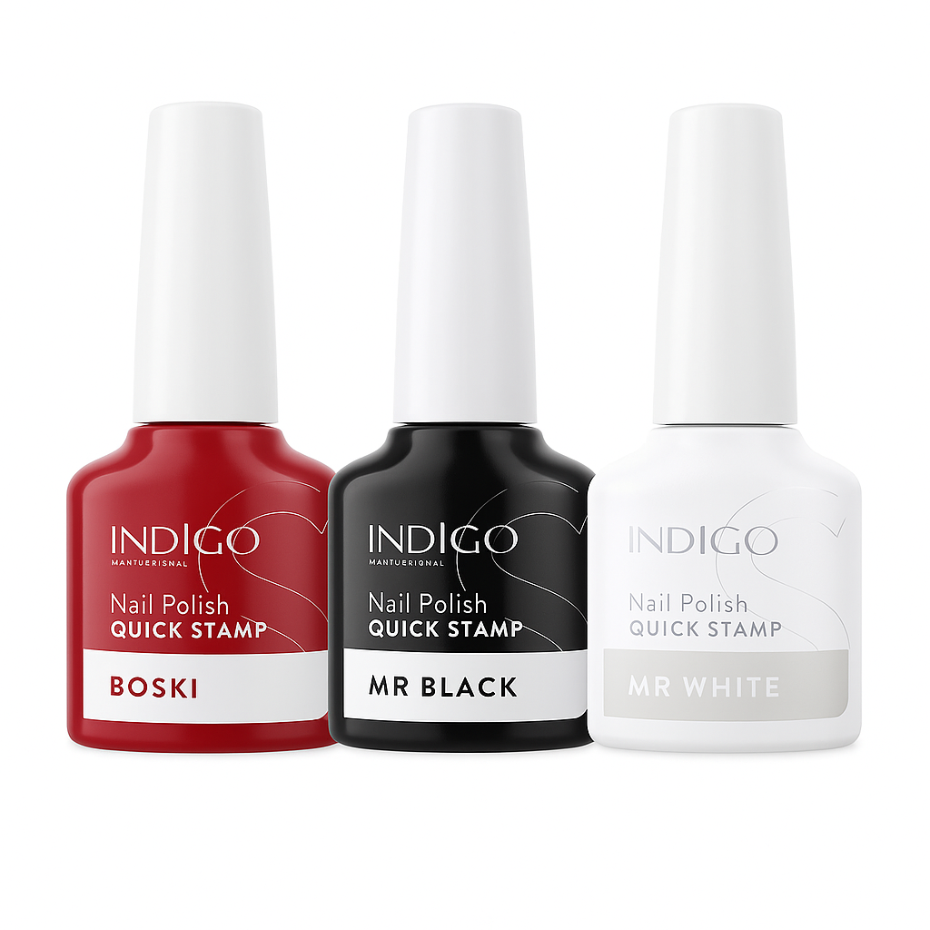 Create sharp, defined stamping designs in seconds with Indigo Quick Stamp Polish — specially formulated for use with nail stamping plates and silicone stampers.